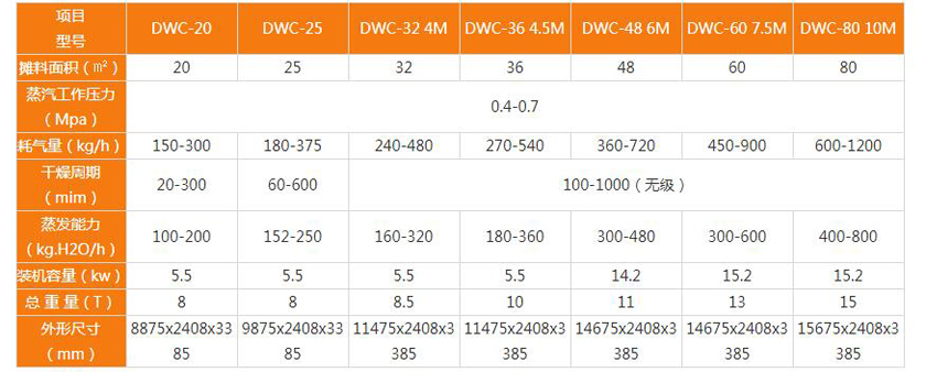 注:图中所示蒸发水量视物料干燥温度,铺料厚度及停留时间而定。