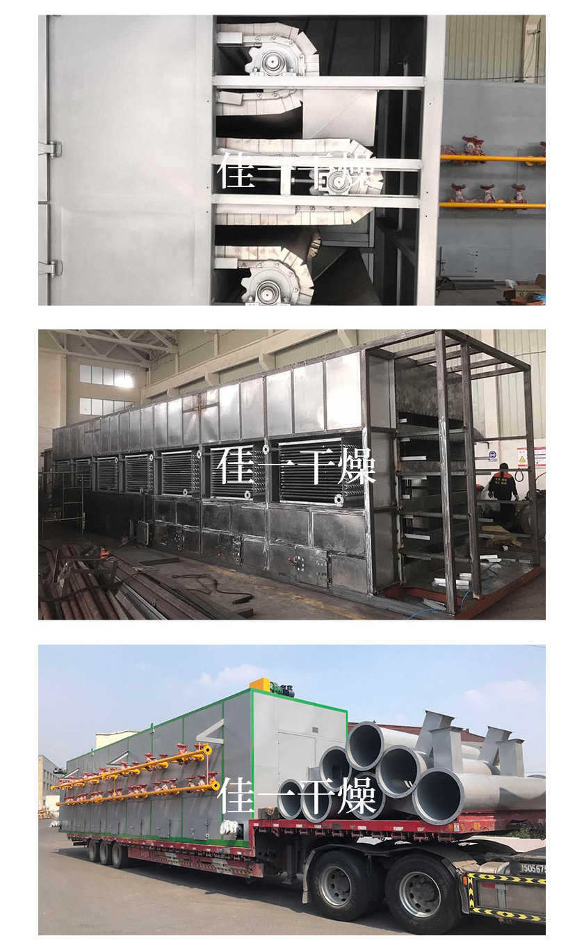 物料由加料器均匀地铺在网带上,网带一般采用12-60目不锈钢丝网,由传动装置拖动在干燥机内移动。干燥机由若干单元组成,每一单元热风独立循环,部分尾气由专门排湿风机排出,废气由调节阀控制,热气由下往上或由上往下穿过铺满物料的多层网带完成热量与质量传递的进程,带走物料水份。网带缓慢移动,运行速度可根据物料温度自由调节,干燥后的成品连续落入收料器中。上下循环单元根据用户需要可灵活配备,单元数量亦可根据需要选取。